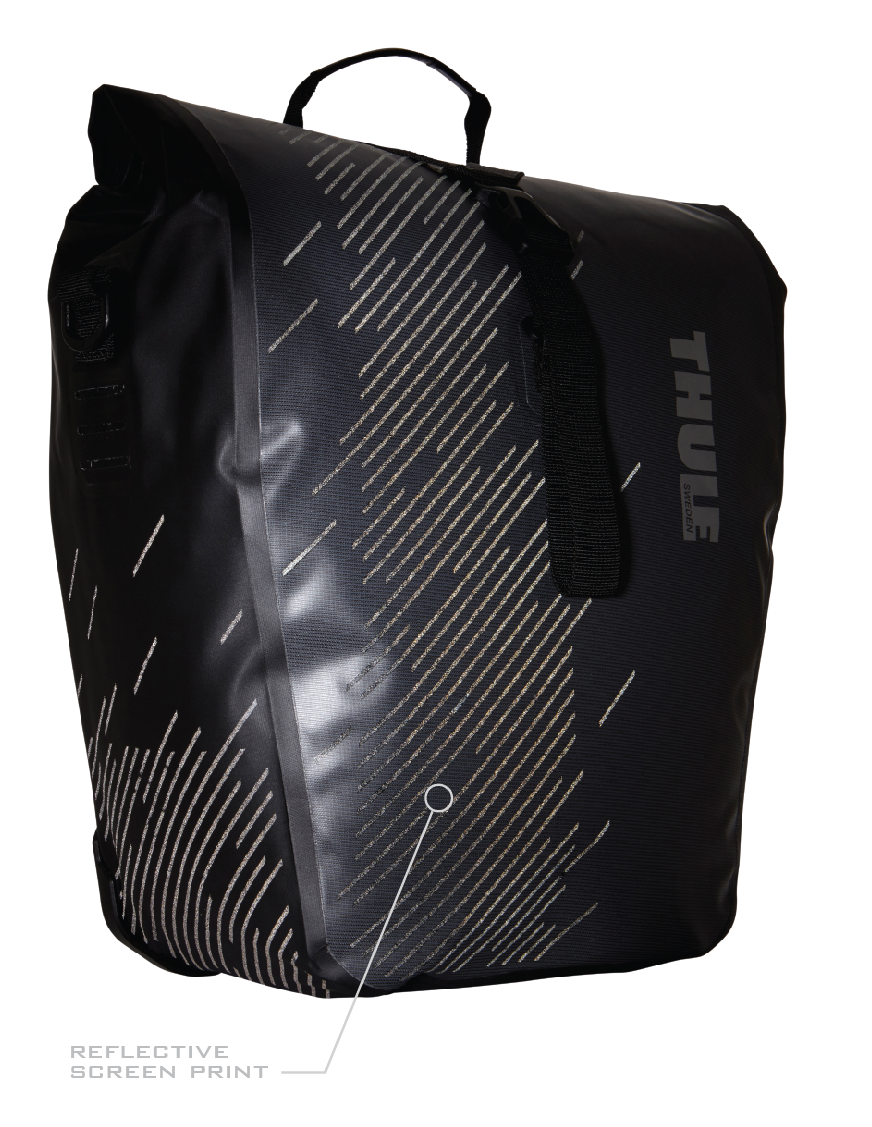 The below illustration represents the final silhouette of the panniers and the reflective pattern applied to the front and sides. In the end we decided that the screen print application should be tonal. In this stage of conceptualization we also had a webbing handle found on the front of the bag, After sampling it was determined to be problematic and was deleted moving forward.